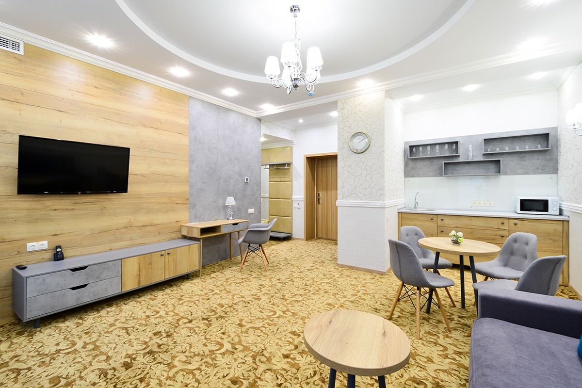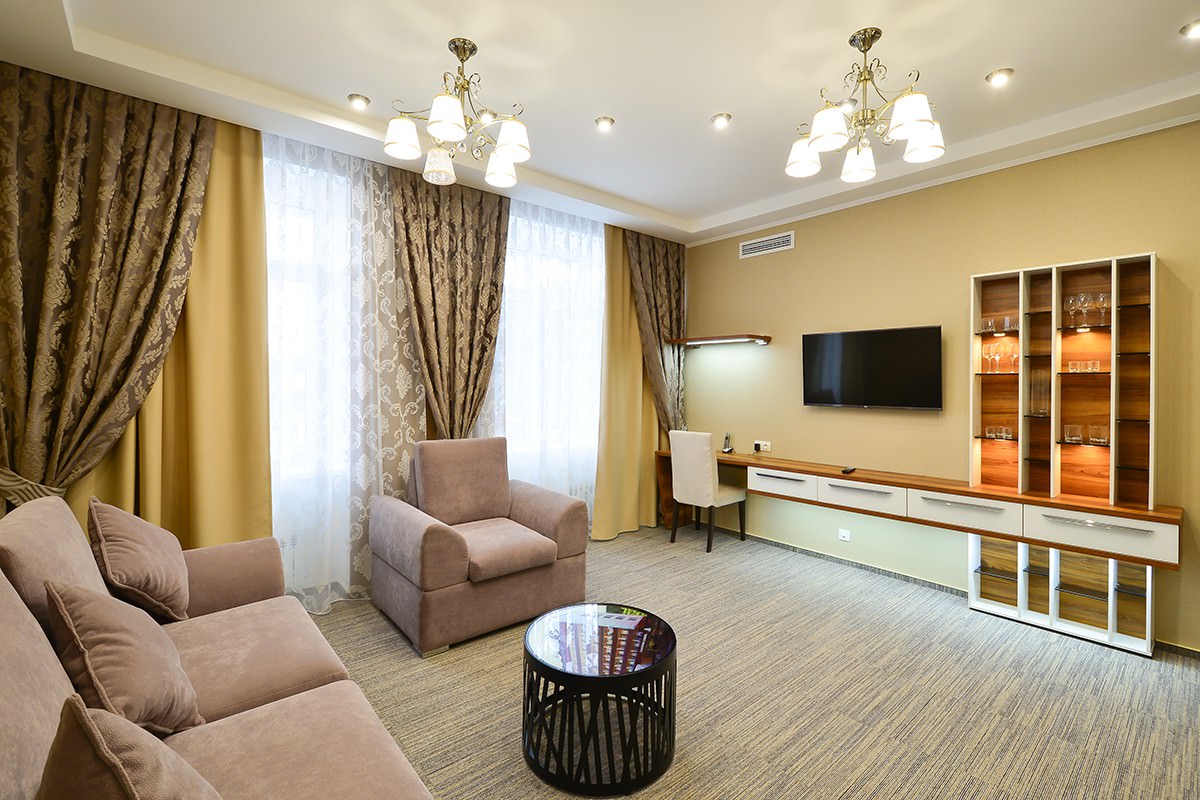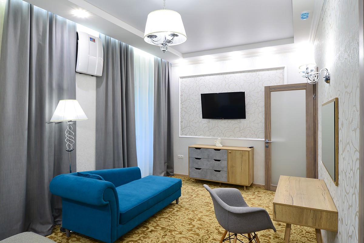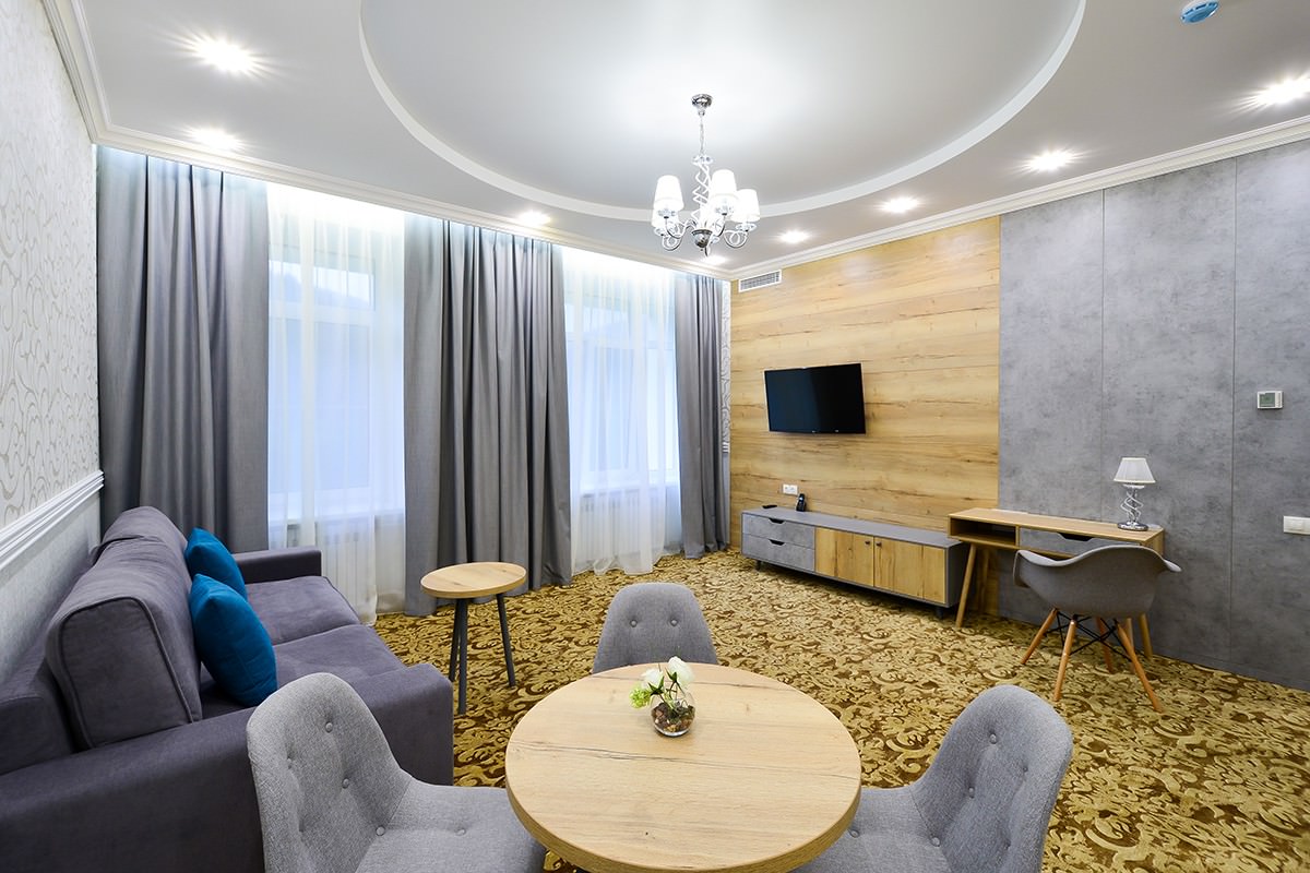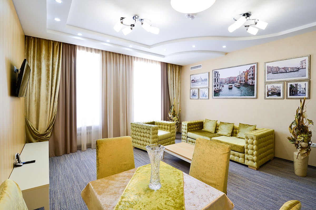 Площадь номера - 58 кв.м. 1 осн. место. 3 доп. места. Мебель: вешалка, диван, зеркало, кресла, кровать двуспальная, прикроватные тумбочки, стол, столик журнальный, стулья, шкаф. Оборудование: гладильная доска, кондиционер, микроволновая печь, стиральная машина, телевизор ЖК, утюг, холодильник, чайный набор посуды, электрочайник. Санузел: биде, с ванной, тапочки, туалетные принадлежности, фен, халат. Сервис: Wi-Fi бесплатно, карточная система замков, смена полотенец, смена постельного белья, уборка номера.